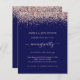 A value for money BUDGET alternative on a smaller size 4.5 x 5.6” semi-gloss 110lbs weight, which is of similar thickness to a postcard (however is not suitable to use as a postcard.). PLEASE NOTE there is ONE invite per sheet. Budget Rose Gold Glitter Navy Blush Evening Party Wedding Invite. Faux glitter borders the top on each side, and "evening party" is in a stylish script with swashes. Easily personalise the text to your own details which is in soft blush pink on a navy blue background.