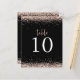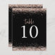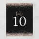 A size 4.5 x 5.6” semi-gloss 110lbs weight, which is of similar thickness to a postcard, with ONE per sheet. Table is in a set handwriting style script and your table number beneath with faux glitter borders and classic black background. . Easily personalise the number. The same design is also on the back.