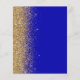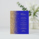 The left-hand edge of this elegant modern wedding menu features a gold faux glitter border. The customisable text combines gold-coloured whimsical handwriting script and copperplate fonts on a royal blue background. The reverse side features a matching royal blue and gold glitter design.
