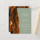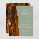 The left-hand edge of this elegant modern wedding invitation features a watercolor agate border in shades of burnt orange and rust, trimmed with faux gold glitter. The customisable text combines ivory handwriting, copperplate and italic fonts on a sage green background. The reverse side features a matching burnt orange, rust and gold agate design.