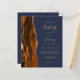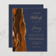 Save the cost of printing and mailing separate RSVP cards with this elegant modern all-in-one budget wedding invitation. The left-hand edge features a burnt orange and rust watercolor agate border trimmed with gold faux glitter. The customisable text combines gold-coloured handwriting, copperplate and italic fonts on a navy blue background. The reverse side provides space for wedding details on a solid navy blue background, along with a QR code guests can scan to visit your website and RSVP.
