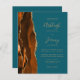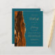 Save the cost of printing and mailing separate RSVP cards with this elegant modern all-in-one budget wedding invitation. The left-hand edge features a burnt orange and rust watercolor agate border trimmed with gold faux glitter. The customisable text combines gold-coloured handwriting, copperplate and italic fonts on a teal blue background. The reverse side provides space for wedding details on a solid teal background, along with a QR code guests can scan to visit your website and RSVP.