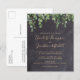 Invite your friends and family to your wedding with these rustic chalkboard slate with eucalyptus, elegant but casual wedding invitation postcards. These budget wedding invitation postcards need to be mailed as oversized postcards so may incur standard postage fees but they don't need an envelope or a return address label. Personalise with names, wedding date, location and any other info. Add website and any other information on the back. These unique greenery wedding invitations will make a lasting impression. COPYRIGHT © 2020 Judy Burrows, Black Dog Art - All Rights Reserved. Budget Rustic Eucalyptus Wedding Invitation