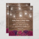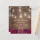 Budget rustic country wedding invitations featuring a wooden background, red burgundy marsala florals, mason jars with string lights and a elegant editable wedding template.