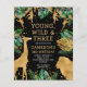 Celebrate your little wild thing's third birthday with this "Young, Wild & Three" jungle safari themed invitation, featuring gold faux foil animals (giraffe, lion and monkeys), gold and green jungle foliage, and a sprinkling of gold confetti. Add your child's name and party details in gold and white text on a black background. A coordinating jungle foliage pattern in green and gold decorates the back of the card.