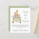 Cute budget-friendly baby shower thank you card featuring an illustration of baby zoo animals (lion, elephant, zebra, monkey and giraffe) piled into a safari vehicle. You can easily personalise a thank you message, add your baby's name and birthdate on the vehicle, and add your names in a grey signature-like script.