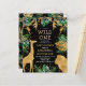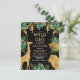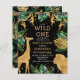 This "wild one" jungle safari themed baby shower invitation features gold faux foil animals (giraffe, lion and monkeys), gold and green jungle foliage, and a sprinkling of gold confetti on a black background. Add the name of the mum-to-be and shower details in white and gold text. A coordinating jungle foliage pattern in green and gold on a black background decorates the back of the card.