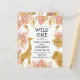 This "wild one" jungle safari themed girl's baby shower invitation features gold faux foil animals (giraffe, lion and monkeys), gold and pink jungle foliage, and a sprinkling of gold confetti on a white background. Add the name of the mum-to-be and shower details in black text. A coordinating frame pattern of pink and gold leaves appears on the reverse.