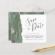This elegant budget save the date card features a sage green watercolor agate border trimmed with faux gold glitter. The customisable text combines charcoal grey handwriting script, copperplate and italic fonts on a white background. The reverse side features a matching sage green and gold agate design.