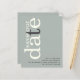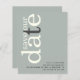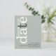 Minimalist Sage Ivory QR Code Text Save The Date. A budget price SMALLER 4.5” x 5.6” alternative. Available in a SEMI-GLOSS 110 lb CARD STOCK which is the default option (thicker for invitations), OR a SATIN FINISH 80 lb THINNER PAPER STOCK (ideal for enclosures). A modern typographical design in natural eathy tones to invite your family and friends to save your date, with Save Our Date in large typography rotated and to the left hand side at the top in ivory, with a grey letter "t" on a background of light sage green. Easily personalise the rest of the text. Add your QR code to your wedding website on the back by replacing the QR code on the sample. You can create QR codes for free online. Simply search “QR code creator” and lots of options come up to create for free.