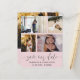 Cute save our date announcement. This template features space for 4 of your favourite couples photos in white with cool hand written calligraphy in dark grey. Easy to edit with your own unique details.