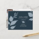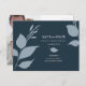 This budget wedding save the date postcard features minimalist dusty blue leaves with the bride and grooms details in white over a midnight blue background. The simple card reverses to include your couple's photo and space to write in the recipients address. To see the complete modern navy blue wedding stationery line visit www.zazzle.com/dotellabelle