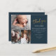 This Budget Script 3 Photo Collage Baby Thank You Card features modern gold handwritten calligraphy thank you and personal message on the front. Click the personalise button to customise this design with your photos and details.