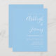 This simple modern wedding invitation features white text on a pastel baby blue background. Add the names of the bride and groom in stylish handwriting calligraphy and the details in sans serif font. The reverse side is a matching shade of solid baby blue.