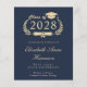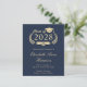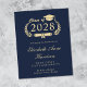 Modern budget-friendly dark navy blue college graduation announcement featuring "Class of" in a gold illustration of a laurel wreath incorporating a grad cap topper and diploma and the graduate's name in an elegant light gold script. Add their school, major, honours or future plans.