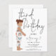 A budget price smaller 4.5" x 5.6" paper alternative. Envelopes are an optional extra. This cool design for your daughter's 3rd birthday has trendy handwriting style script and an abstract illustration of a little girl in outfit with a rainbow patternon a white background.