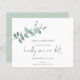 A value for money BUDGET alternative on a smaller size 4.5 x 5.6” semi-gloss 110lbs weight, which is of similar thickness to a postcard (however is not suitable to use as a postcard.). PLEASE NOTE there is ONE invite per sheet . Budget Script Green Eucalyptus Save The Date. A minimalist botanical design to invite your guests to save your date. Kindly Save Our Date is in a modern set script.The rest of the text you can easily personalise. Text and background colours can be changed if you wish via the customise further option.