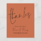 Budget Script New Mr Mrs Wedding Terracotta Thanks. A budget price SMALLER 4.5” x 5.6” alternative. Available in a SEMI GLOSS 110 lb CARD STOCK which is the default option (recommended for invitations), OR a SATIN FINISH 80 lb THINNER PAPER STOCK (ideal for enclosures). Envelopes are an optional extra and are slightly larger than the card size. Thanks and Mr & Mrs are set in a stylish handwritten script on the front and the rest of the text on each side you can easily personalise with your names, and your thank you message for your guests. Can be changed to any colour of your choice via the customise further option.