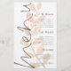 A budget price size 5.5” x 8.5”, on an elegant 110 lb LINEN stock – for a luxury feel at great value, this is perfect for menus, as well as invitations and programs etc. This budget size alternative is also available in other paper choices. The SEMI-GLOSS 110 lb card stock is about the same thickness as a postcard, so also works well for invitations. The FELT 100 lbs paper is buff coloured, NOT white, so adds a rustic touch. The MATTE 80lbs paper stock is bright white, for crisp printing, great for your menus and programs, whilst the SATIN 80lbs paper is thin and light, ideal for enclosures. PLEASE NOTE THE OPTIONAL ENVELOPES ARE A LITTLE BIGGER IN SIZE AT 6.75” x 9” approx. This modern design has Menu in elegant set grey script running up the left hand side and the rest of the text is aligned to the right which you can easily personalise as well as your names and wedding date on the back. Artsy watercolor leaves in peach are tinted in the background on both sides.