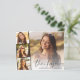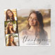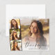 Modern budget-friendly graduation thank you featuring the graduate's photo overlayed with a strip of three smaller square photos, "thank you" in a stylish script, and their name, school and class year in simple typography. On the reverse, customise a thank you message and add the graduate's name in a signature-like script.