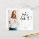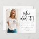 A value for money BUDGET alternative on a smaller size 4.5 x 5.6” semi-gloss 110lbs weight, which is of similar thickness to a postcard (however is not suitable to use as a postcard.). PLEASE NOTE there is ONE per sheet. Budget She Did It Photo Graduation Announcement. Send the happy news of your graduate with this minimalist photo design, with a beautiful set script for She Did It and the rest of the text on both sides is easy to personalise. Replace the sample photo with your own. A gradient overlay layer is on top of your photo so it fades out as it reaches the center with the text partially overlaid on top.