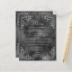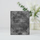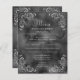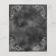 This elegant vintage-inspired wedding menu features the text in pale silver grey script and serif fonts, framed by a vintage silver foliage motif in four corners on a black watercolor background. The frame and watercolor background are repeated on the reverse.