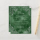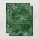 This elegant vintage-inspired wedding menu features the text in pale silver grey script and serif fonts, framed by a vintage silver foliage motif in four corners on an emerald green watercolor background. The frame and watercolor background are repeated on the reverse.