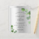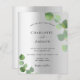 A modern, elegant and minimalist wedding invitation. Faux silver metallic looking background decorated with eucalyptus greenery, sprigs. Personalise and add your names and wedding details. Black coloured letters.