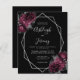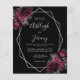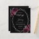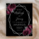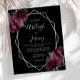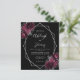 This elegant modern wedding invitation features a silver geometric frame decorated with burgundy and silver flowers on a black background. The customizable text combines silver gray whimsical handwriting, copperplate and italic fonts. The reverse side is solid black.