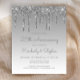 This trendy 25th wedding anniversary party invitation features a sparkly silver faux glitter drip border and silver ombre background. The words "25th Anniversary" and the first names of the couple appear in casual silver grey handwriting script, with the rest of the customisable text in sans serif font. The same silver glitter drip design appears on the reverse side.