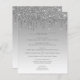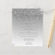 This elegant wedding menu features a top border of silver dripping glitter and silver ombre background. The customisable text combines grey handwriting script and sans serif fonts.