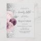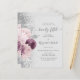 The left-hand edge of this elegant modern 50th anniversary party invitation features a mauve and dusty pink watercolor floral bouquet trimmed with silver foliage and faux silver glitter. The customizable text combines charcoal gray handwriting, copperplate and italic fonts on a pale gray background. The reverse side features a matching design.