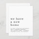 Simple Moving New Home Details. A budget friendly SMALLER 4.5” x 5.6” alternative to advise your new address. Available in a SEMI GLOSS 110 lb CARD STOCK or a SATIN FINISH 80 lb THINNER PAPER STOCK. Envelopes are an optional extra. The header is large in stylish lowercase with the details beneath. Lots of white space at the top for a contemporary feel! Easily personalise the text to your own details.