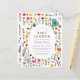 A bright and colourful spring design for your baby shower. The front of this card features a hand-drawn border of garden flowers and leaves, with a watering can in the top right-hand corner, two little bees in the top left-hand corner, and a pair of butterflies in the bottom left-hand corner. The main colours that stand out are turquoise, pink, red, orange, yellow, and green. Your event details appear in rustic typography with "baby shower" in rough serif capitals and the mum-to-be's name in penciled handwriting. Cards reverse to the same border with the middle area also filled with blooming buds and flowers. As part of the budget selection on Zazzle, this sheet isn't a standard invite size or paper quality. If you want this design on an invitation card you can find it in our store or use the Zazzle Make Machine to transfer it onto the product of your choice. Feel free to message me if you have any questions!