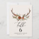 Budget botanical floral rust terracotta, black, natural and sage green antlers rustic table number wedding day decor. On trend script text, part of a matching wedding suite.
