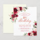 Red roses and blush pink peonies are nestled in dark green leaves on this beautiful and unique birthday invitation.