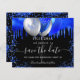 A black background decorated with royal blue drips, confetti, and balloons. Personalise and add a date and name/age. The text: Save the Date is written with a large trendy hand lettered style script.