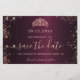 A girly and trendy Save the Date card for a Sweet 16, 16th birthday party. A burgundy faux metallic looking background colour. Decorated with rose gold faux glitter dust and a tiara, crown. The text: Save the Date is written with a large trendy hand lettered style script.