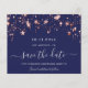 A girly and trendy Save the Date for a Sweet 16, 16th birthday party. A navy blue background with rose gold stars. The text: Save the Date is written with a large trendy hand lettered style script. Light grey coloured letters.