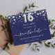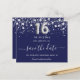 A girly and trendy Save the Date card for a Sweet 16, 16th birthday party. A navy blue coloured background. Decorated with faux silver stars. The text: Save the Date is written with a large trendy hand lettered style script. Number 16 is written with a balloon style font.