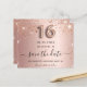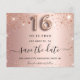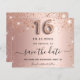 A girly and trendy Save the Date card for a Sweet 16, 16th birthday party. Rose gold faux metallic looking background decorated with rose gold and faux glitter dust. Personalise and add a date and name/text. The text: Save the Date is written with a large trendy hand lettered style script with swashes. Number 16 with a balloon style font.