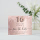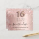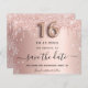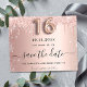 A girly and trendy Save the Date card for a Sweet 16, 16th birthday party. Rose gold faux metallic looking background decorated with rose gold and faux silver glitter drips and dust. Personalise and add a date and name/text. The text: Save the Date is written with a large trendy hand lettered style script with swashes. Number 16 with a balloon style font.