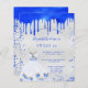 A faux silver looking background. Decorated with royal blue paint dripping look, sparkles. Personalise and add a name and party details. The name is written with a hand lettered style script.