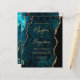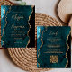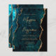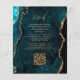 This elegant wedding invitation features a background image of teal blue watercolor agate trimmed with faux gold glitter. The customisable text combines gold-coloured modern handwriting, copperplate and italic fonts. The reverse side provides space for wedding details on a matching teal agate background, along with a QR code guests can scan to visit your website and RSVP, which saves the cost of printing and mailing separate RSVP cards.