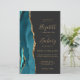 The left-hand edge of this elegant modern wedding invitation features a teal blue watercolor agate border trimmed with faux gold glitter. The customisable text combines gold-coloured handwriting, copperplate and italic fonts on an off-black background. Add additional details on the back, along with a QR code to help your guests visit your wedding website.