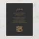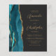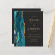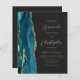 The left-hand edge of this elegant modern wedding invitation features a teal blue watercolor agate border trimmed with faux gold glitter. The customisable text combines gold-coloured script and sans serif fonts on a slate black background. The reverse side provides space for wedding details on a solid slate black background, along with a QR code guests can scan to visit your website and RSVP, which saves the cost of printing and mailing separate RSVP cards.