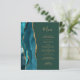The left-hand edge of this elegant modern wedding menu features a teal blue watercolor agate border trimmed with faux gold glitter. The customisable text combines gold-coloured handwriting script and copperplate fonts on an emerald green background. The reverse side features a matching teal and gold agate design.