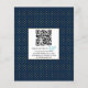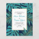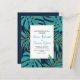 BUDGET teal, navy blue and gold tropical monstera and palm leaves wedding invitation with QR code to RSVP online. It showcases a pattern of tropical leaves in teal blue with gold outline on navy blue and your text in a white frame. The back includes a gold polka dot pattern on navy background and the QR code.