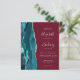 The left-hand edge of this elegant modern wedding invitation features a teal blue watercolor agate border trimmed with faux silver glitter. The customisable text combines handwriting, copperplate and italic fonts in silver grey on a burgundy background. The reverse side features a matching teal and silver agate design.