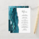 The left-hand edge of this elegant modern wedding menu features a teal blue watercolor agate border trimmed with faux silver glitter. The customizable text combines charcoal gray handwriting script and copperplate fonts on a white background. The reverse side features a matching teal and silver agate design.